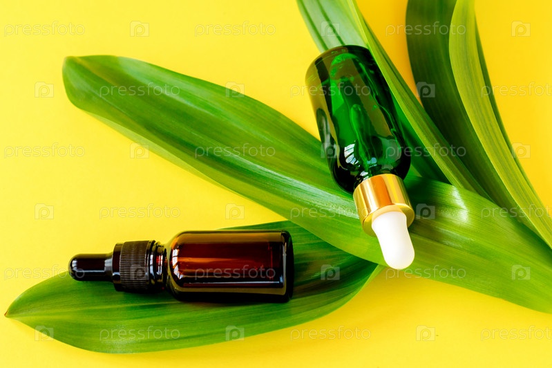 Натуральный контейнер для бутылок по уходу за кожей и органический зеленый лист на желтом фоне. Концепция домашних средств и косметических средств