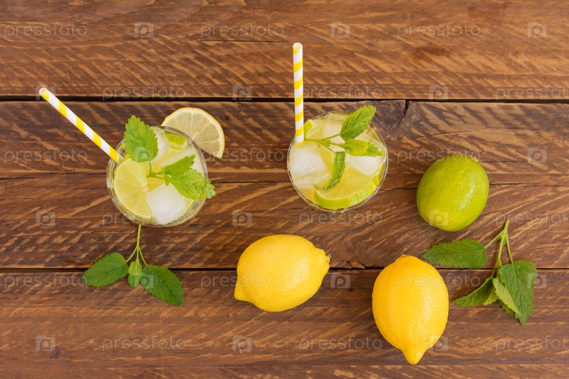 Вид сверху на летние охлаждающие напитки на деревянном столе.Coolig свежий лимонад с лаймом, лимоном, листьями мяты и льдом