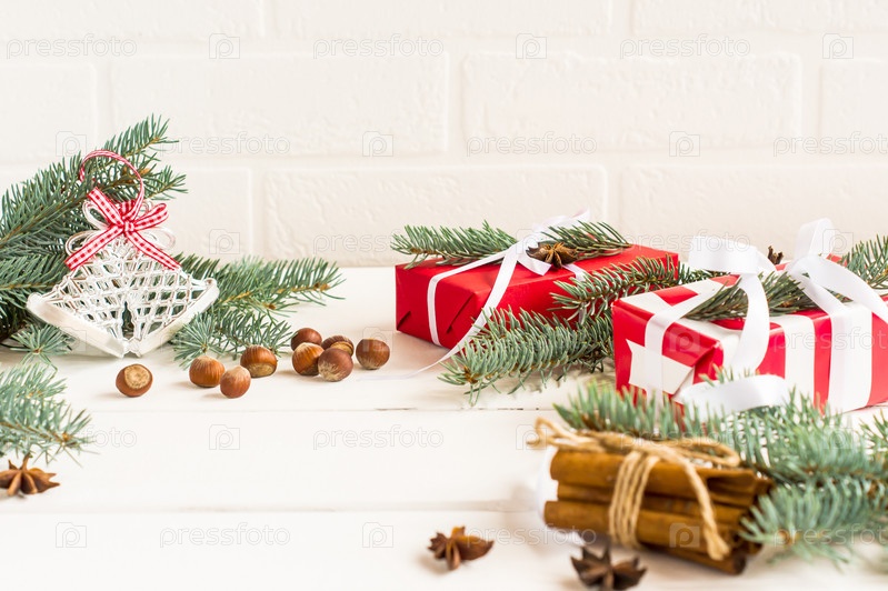 Новогодняя праздничная композиция на белом деревянном фоне. подарочные коробки, украшенные еловые ветки, орехи и палочки корицы на столе