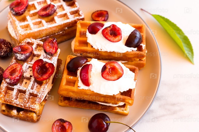 Бельгийские вафли на тарелке с сочной вишней и йогуртом. вкусный здоровый завтрак