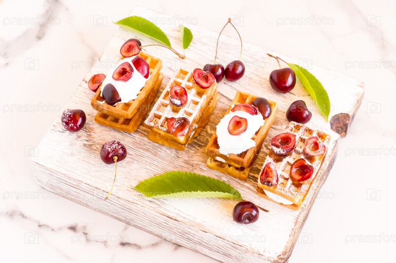 Вкусные бельгийские вафли со взбитыми сливками и спелой вишней на белой деревянной доске