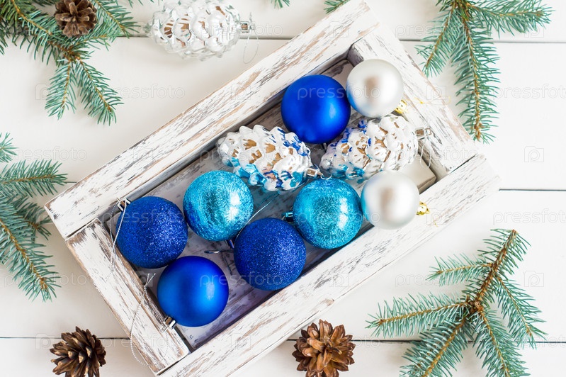 Синие, серебряные елочные шары в деревянном ящике на белом деревянном фоне. вид сверху