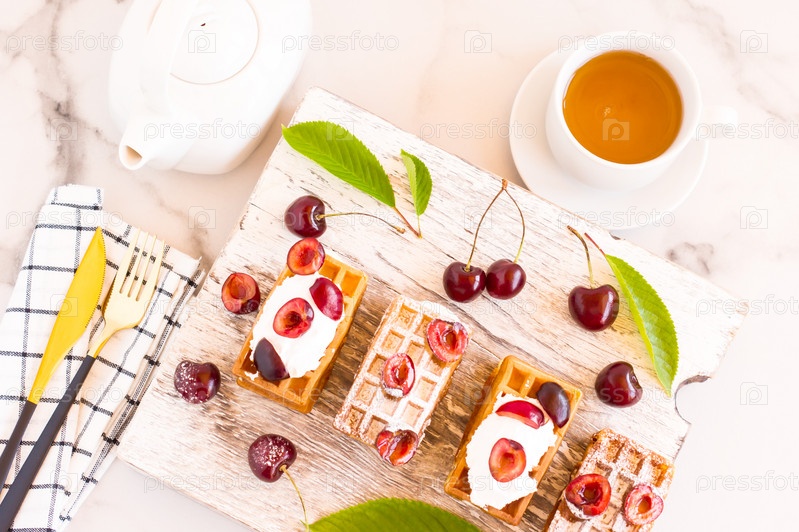 Вкусный завтрак. Бельгийские вафли со взбитыми сливками и спелой вишней. чашка ароматного чая