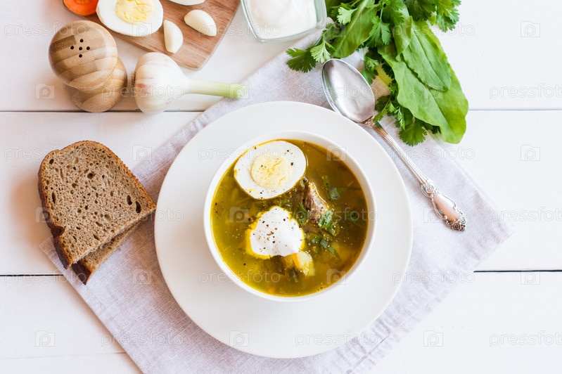На белом деревянном столе с весенним овощным супом из щавеля со сметаной и куриным яйцом. вид сверху