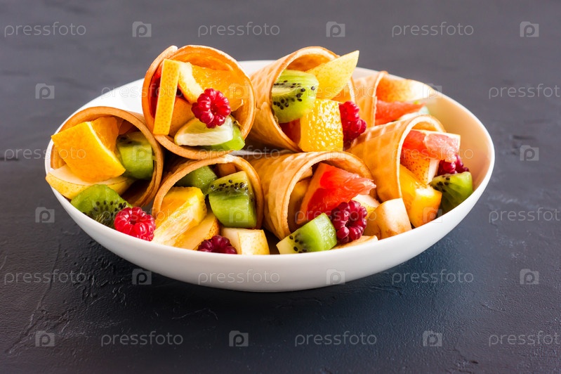 Белая тарелка с вафельными рожками с фруктами на черном фоне