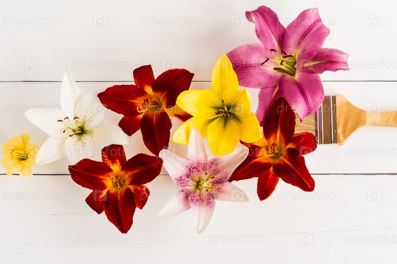 Цветочная креативная композиция. яркие лилии на белом деревянном фоне кистью. белый деревянный фон. вид сверху