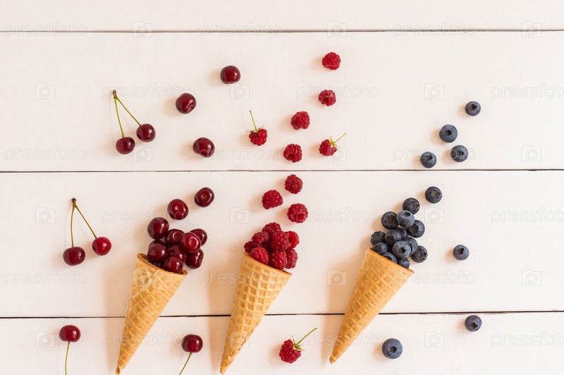 Хрустящие вафельные рожки с летними ягодами на белом деревянном столе. освежающий десерт