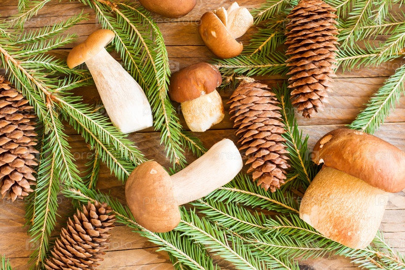 Лесные белые грибы среди еловых ветвей и шишек на деревянном фоне. вид сверху. осенняя композиция