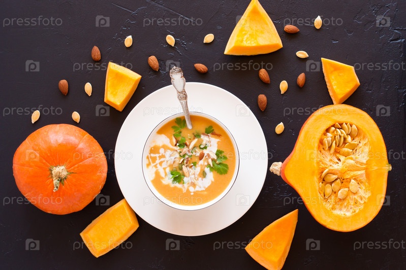 Тарелка тыквенного супа, спелая тыква с семенами и миндалем на черном фоне. вид сверху