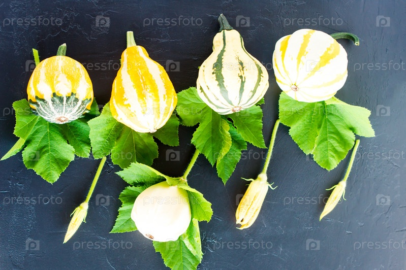 Осенняя композиция из декоративных тыкв разной формы, тыквенных цветов и листьев на черном фоне. плоская планировка