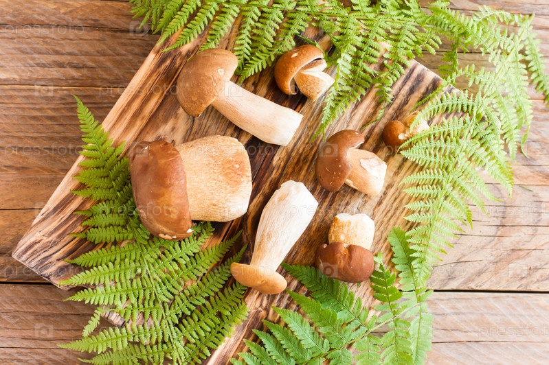 Грибы боровик на деревянной доске. вид сверху. деревенский стиль