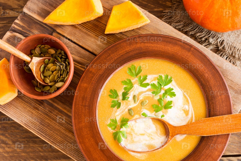 Традиционный сезонный суп из тыквы на деревянном столе в тарелке с деревянной ложкой. деревенский стиль