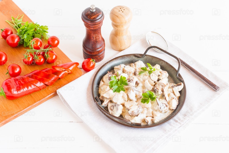 Грибы в сметанном соусе в сковороде на белом фоне. концепция вкусной здоровой пищи