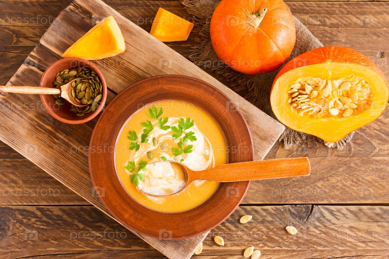 Тыквенный суп на кокосовом молоке с тыквенными семечками и петрушкой. диетическое питание. деревянный фон. деревенский стиль