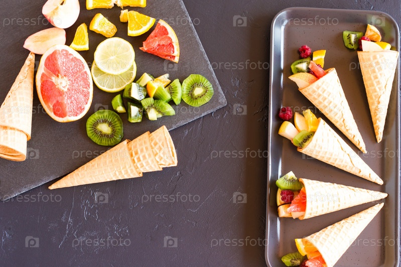 Сладкое угощение к празднику. вафельные рожки со спелыми фруктами. вид сверху