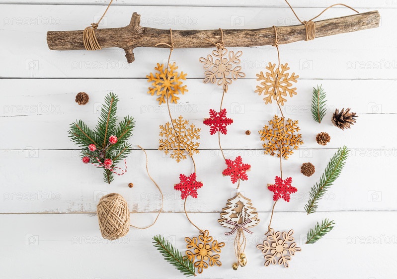 Новогодняя гирлянда из деревянных снежинок на толстой деревянной ветке. зеленые ветки ели, шишки. белый деревянный фон из досок
