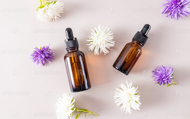 Две стеклянные бутылки с косметикой или сывороткой для ухода за кожей лица. эффект глубокого увлажнения и питания кожи. вид сверху