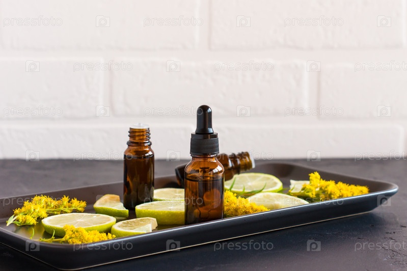 Эфирные и косметические мвсла в стеклянных бутылках на керамической тарелке с ломтиками лимона и желтыми цветами. нетрадиционная медицина
