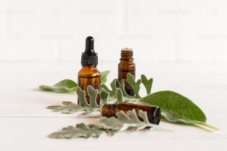 Концепция натурального органического эфирного масла. две бутылки с косметическим натуральным средством на фоне стены из белого кирпича