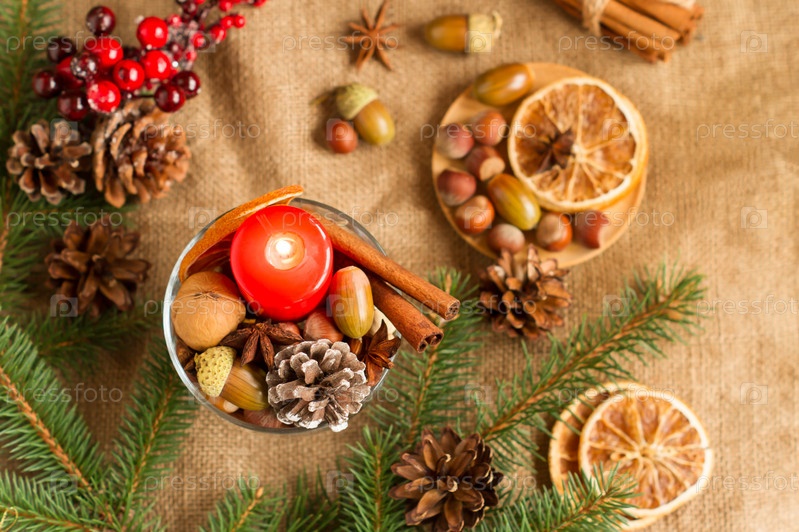 Новогодний и рождественский декор из ягод, шишек, орехов, апельсиновых долек в композиции с красной свечой на фоне мешковины