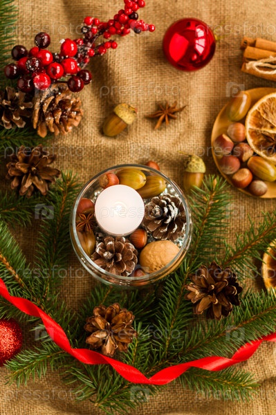 Новогоднее украшение своими руками для украшения дома или стола к празднику. в стеклянной вазе свеча, орехи, шишки, желуди. вид сверху