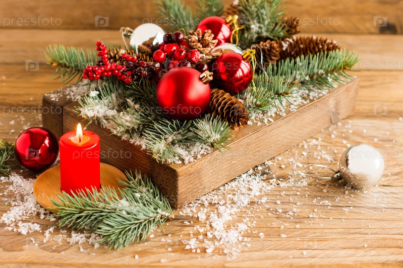 Декор для празднования нового года и рождества. горящая свеча и деревянный ящик с елочными шарами, ветками, шишками