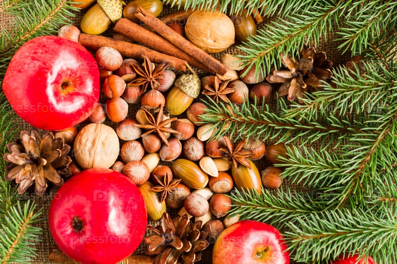 Рождественский праздничный фон с еловыми ветвями, шишками с натюрмортом из леса и натуральных ингредиентов. вид сверху