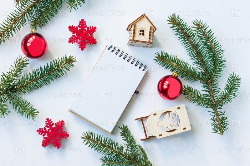 Новогодний или рождественский фон с праздничными украшениями со страницей блокнота. вид сверху. плоская кладка. макет