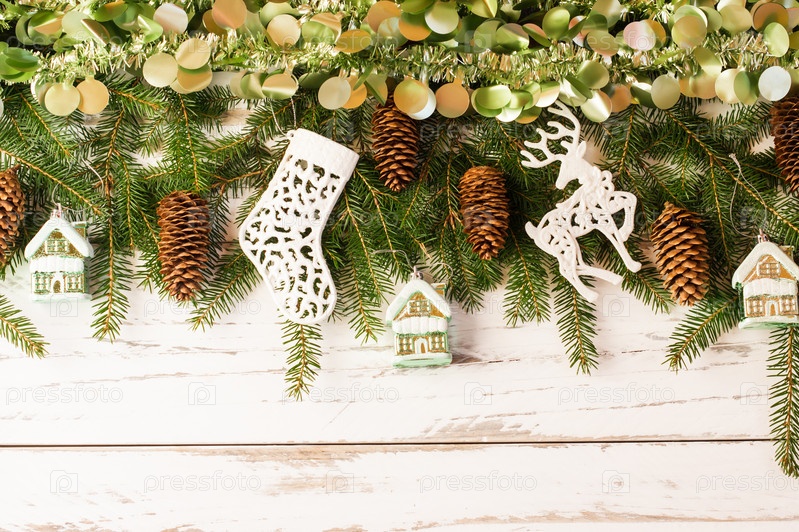 Рождественский новогодний фон с большой гирляндой украшений на белом деревянном столе. вид сверху