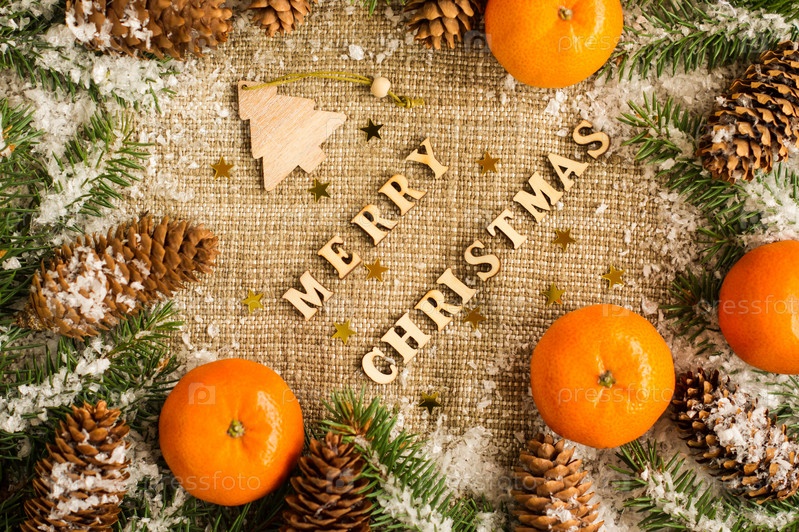 Рождественский праздник фон с буквами счастливого Рождества, цитрусовые, еловые ветки и шишки. вид сверху. мешковина