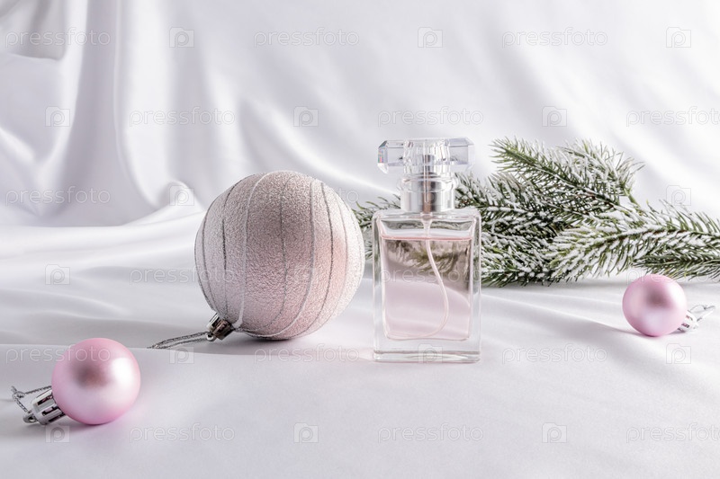 Новогодняя презентация и реклама женского аромата. шикарный флакон духов на фоне рождественского украшения