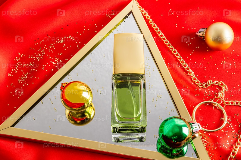 Косметическая бутылка туалетной воды лежит на зеркале с рождественскими стеклянными шарами. красный атласный фон ткани. рекламная концепция