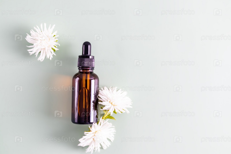 Стеклянный флакон-капельница с сывороткой для лица, для ухода за омолаживающей кожей лица. серый фон. вид сверху. пространство для копирования