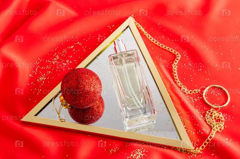 Стеклянная бутылка женских духов лежит на зеркале с красным елочным шаром. атласно-красный фон — традиционный цвет нового года. вид сверху