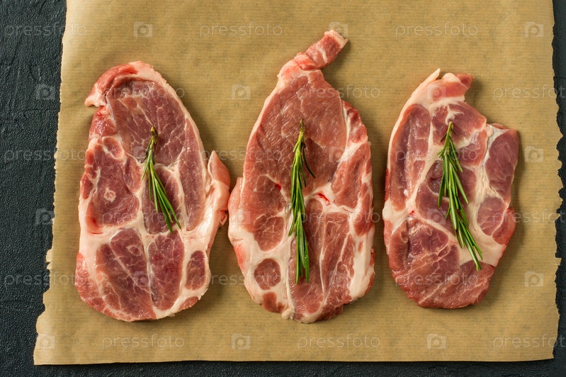 Вид сверху на свежие нарезанные стейки из свинины с розмарином на бумаге для выпечки, готовые к приготовлению. Кулинария и кулинария