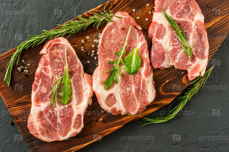 Стейки из сырой свинины с розмарином и помидорами. Свежая свинина. Стейк из шеи. Органическое мясо Кето и Палеодиета
