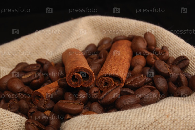 Коричневые жареные зерна кофе в холщовом мешке на черном фоне