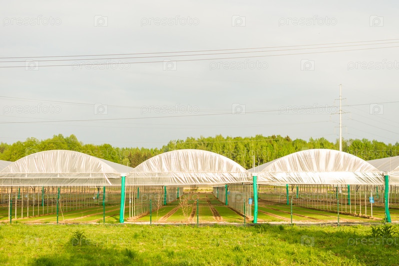 Крупный план современного тепличного комплекса на фоне голубого неба. Выращивание органических растений на продажу