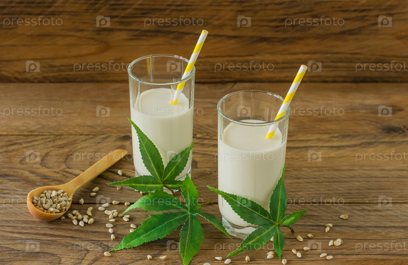 Стаканы с каннабисом, травяным веганским глютеном и безлактозным молоком и листьями конопли на деревянном столе