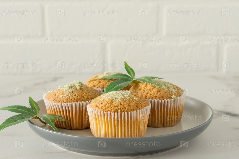 Здоровые и вкусные веганские и безглютеновые кексы в ряд с семенами конопли на мраморном столе. Кексы с марихуаной и листьями конопли