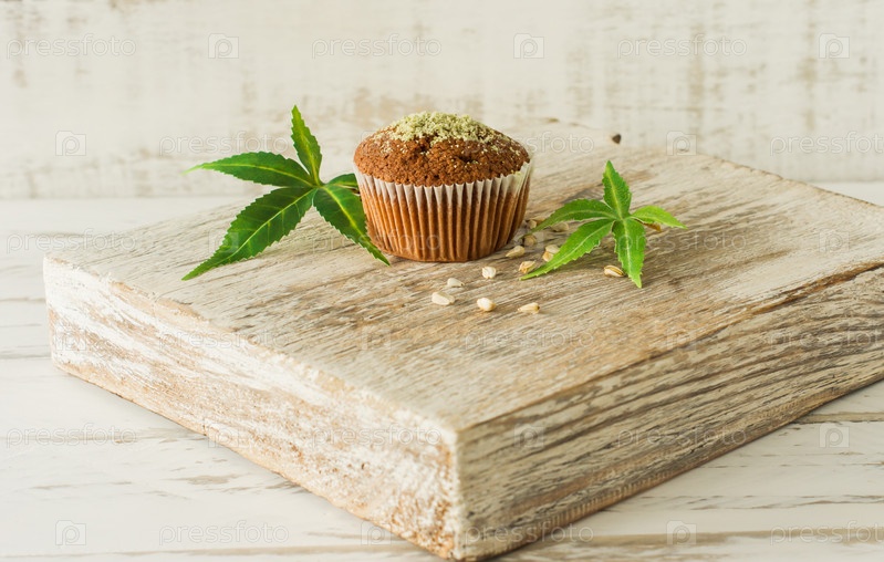 Здоровые и вкусные веганские и безглютеновые кексы с семенами конопли на белой тарелке на деревянном столе. Кексы с марихуаной и листьями конопли
