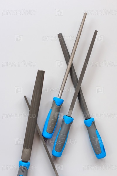Набор новых файлов рашпиля на сером фоне. Расположение рабочих инструментов