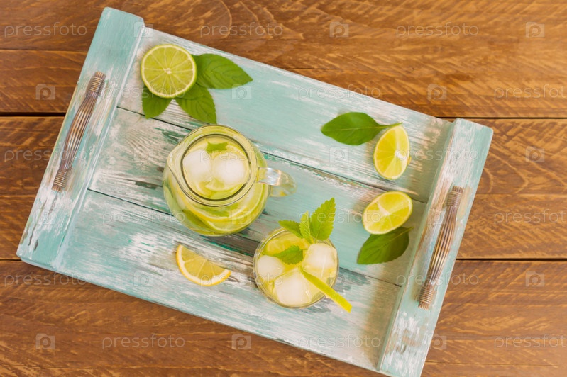 Летний свежий холодный лимонад с лаймом, лимоном, мятой и льдом подается на синем деревянном подносе. Безалкогольный напиток
