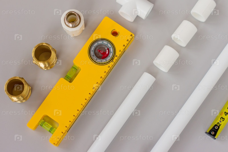 Сантехника и детали трубопроводов с измерительным уровнем и линейкой. Сантехника плоская планировка концепции фона с копировальным пространством
