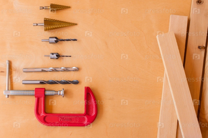Плоская планировка набора инструментов для строительных работ и обслуживания дома на деревянном фоне. Вид сверху