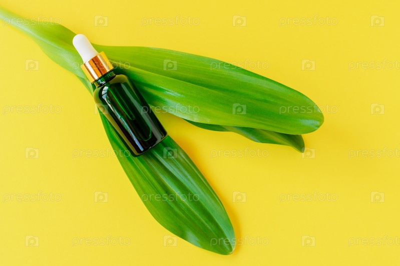 Бутылка сыворотки на зеленом листе. Модный косметический продукт для молодой кожи. Дополнительный этап увлажнения в ежедневном уходе за лицом