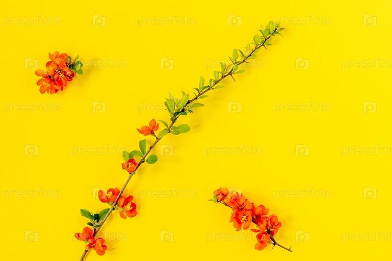 Абстрактный весенний фон. Ветка цветущей японской айвы на желтом фоне. Хеномелес японский. Плоская планировка, вид сверху. Композиция из весенних цветов