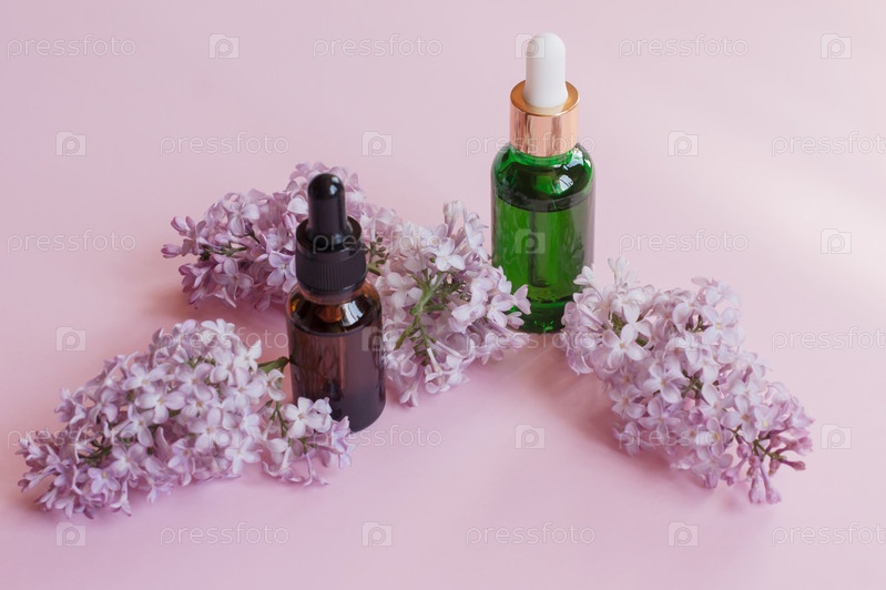 Средства по уходу за кожей - эфирное масло и сыворотка - на фоне свежей сирени, крупный план, сирень в качестве фона. Концепция ухода за кожей и красоты