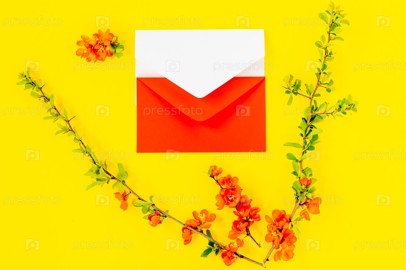Креативная плоская планировка макета рамки пустых конвертов и лепестков цветов айвы на желтом фоне с копировальным пространством в минимальном стиле, шаблон для надписей, текста или вашего дизайна