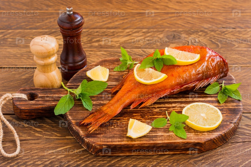 Вкусный копченый морской окунь на деревянной разделочной доске для здоровой пищи, диеты или кулинарной концепции, избирательный фокус